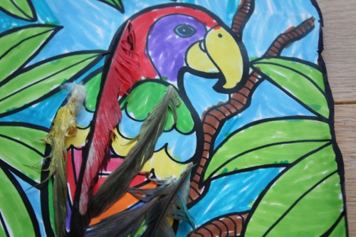 Quand les pies oublient quelques plumes dans le jardin, nous les colorons... pour parer un perroquet. Prenez un coloriage de perroquet (j'ai trouvé le nôtre ici). Laissez votre enfant le colorier avec des couleurs vives. Ramassez quelques plumes dans votre jardin ou lors d'une balade. Sortez la peinture pour leur donner de la couleur. Collez... Lire la Suite →
