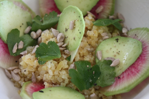 Avec l'arrivée du printemps, on a envie d'abandonner les plats chauds (et les choux 😉 pour des salades. Alors, voici une variante du taboulé, inspirée par le contenu de mon panier de légumes. Ingrédients (pour les quantités, à vous de décider en fonction de nombre de mangeurs) : Radis vertAvocatBoulgourCitronPersilGraines de tournesolSel et poivre Faites... Lire la Suite →